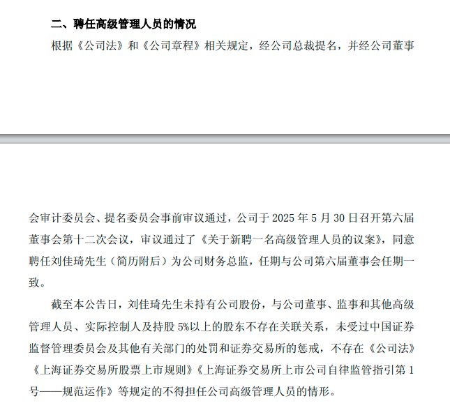 公司同步披露,已依照治理程序完成新任财务总监的聘任工作。根据公告,已审议通过聘任刘佳琦为公司新任财务总监。