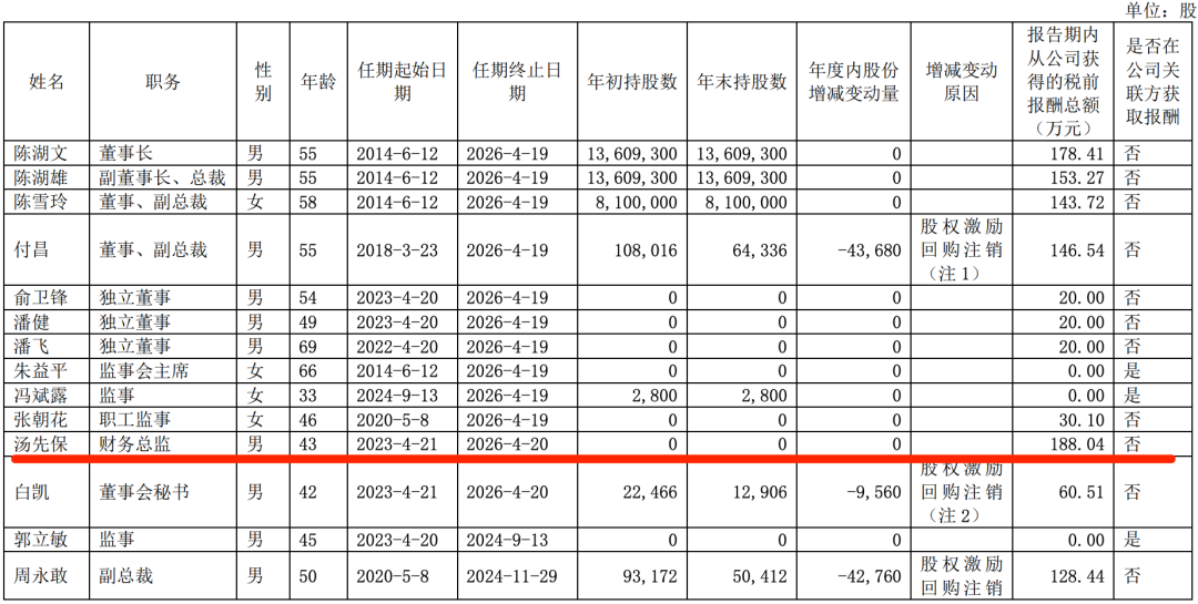 值得一提的是,原任财务总监汤先保任职期间薪酬呈现异常增长态势。2023年其薪酬为93.36万元,至2024年骤增至188.04万元,增幅达101.3%,位列公司高管薪酬榜首。