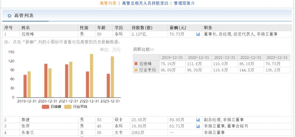 龙蟠科技董事长、总经理、法定代表人、非独立董事石俊峰 2020 年-2023 年薪酬分别为 111.8 万元、110.0 万元、86.19 万元、78.73 万元,连续三年薪酬下降。