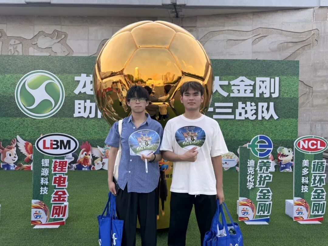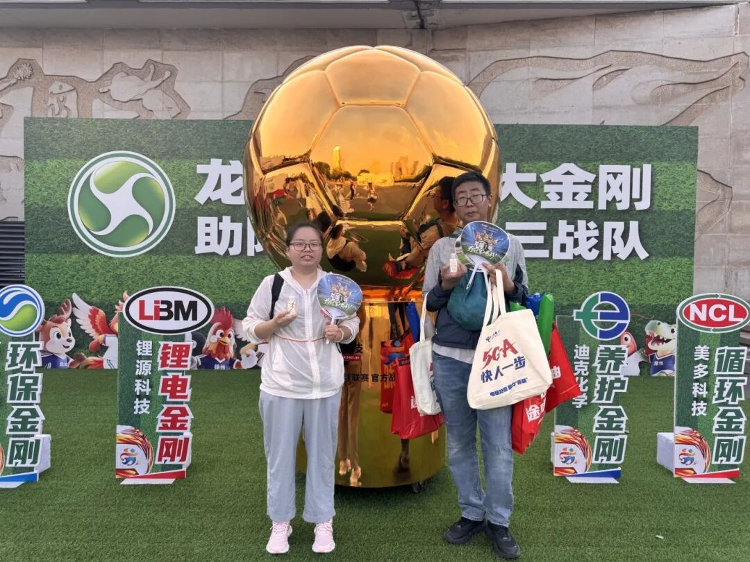 南京奥体中心外,一批又一批围着龙蟠科技展台的金球创意装置,不断变换角度拍照;淮安奥体中心展台,球迷们围住金球舞动大旗,脸上露出兴奋的笑容,口中喊响必胜的口号。