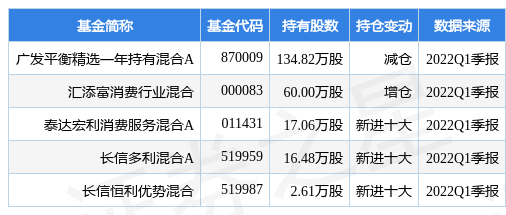 根据2022Q1季报基金重仓股数据,重仓该股的基金共5家,其中持有数量最多的基金为广发平衡精选一年持有混合A。广发平衡精选一年持有混合A目前规模为9.8亿元,最新净值1.0908(5月16日),较上一交易日上涨0.79%,近一年下跌3.7%。该基金现任基金经理为刘淑生。