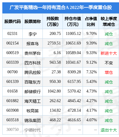 广发平衡精选一年持有混合A的前十大重仓股如下: