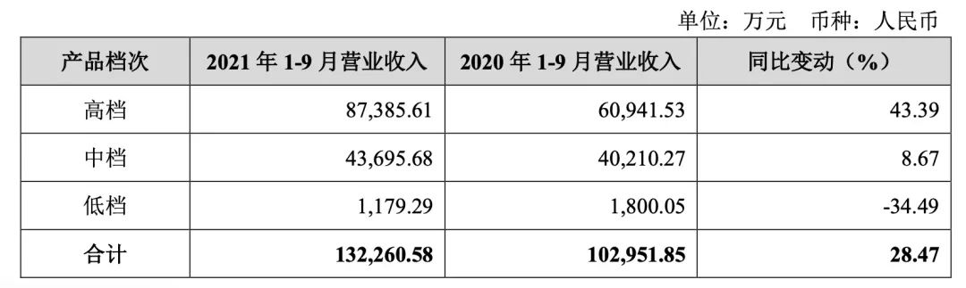 报告显示,2021年金徽酒1-9月高档酒营业收入8.74亿元,比去年同期的6.09亿元,同比增长43.39%。中档酒产品营业收入4.37亿元,比去年同期的4.02亿元,增长8.67%。低档白酒产品销售不仅占比减少,而且持续减少。