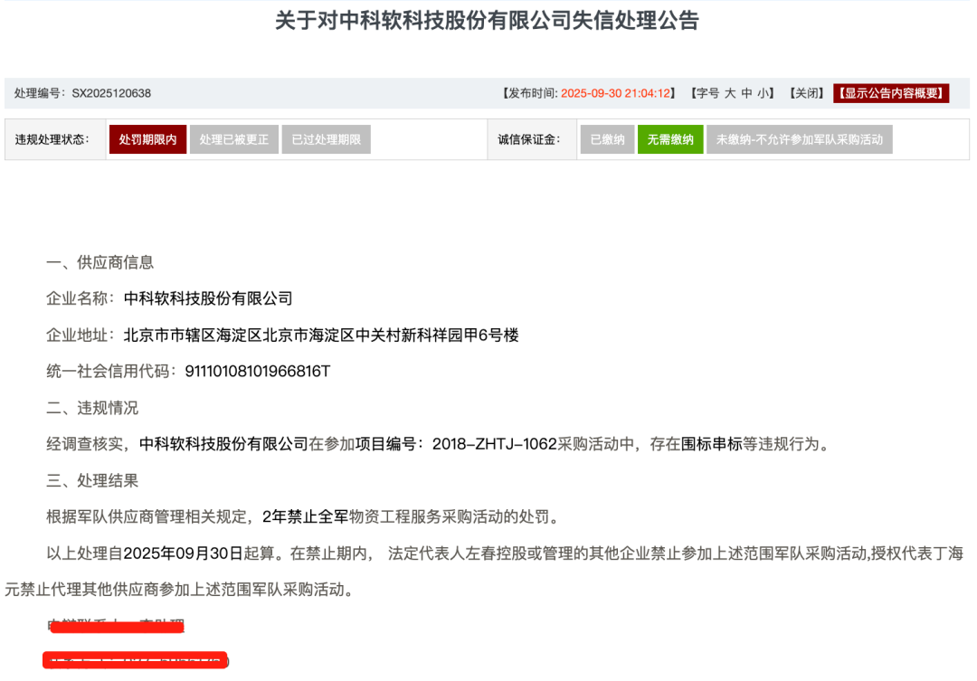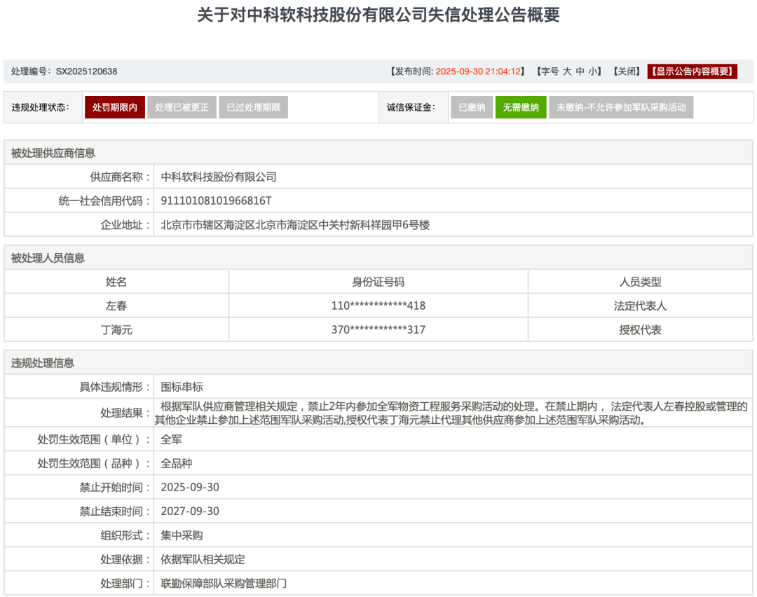 近期,据联勤保障部队采购管理部门发布的公告(处理编号:SX2025120638),中科软科技股份有限公司(证券简称:中科软,代码:603927.SH)因在军队采购项目(编号:2018-ZHTJ-1062)中存在围标串标等违规行为,被处以禁止参与全军物资工程服务采购活动两年的处罚。处罚自2025年9月30日起至2027年9月30日止,覆盖全军范围及全品种采购活动。