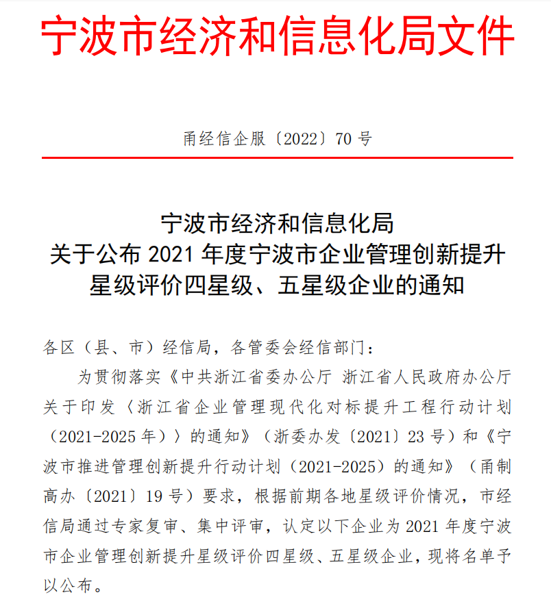 近日,宁波市经济和信息化局公布了2021年度宁波市企业管理创新提升星级评价四星级、五星级企业名单,雪龙集团荣获“2021年度宁波市企业管理创新提升五星级企业”称号!
