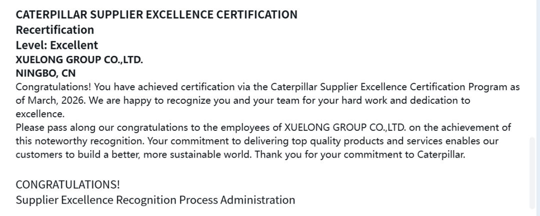 近日,雪龙集团凭借持续卓越的品质表现与精进不懈的技术实力,再次成功通过2025年度卡特彼勒SER供应商审核,并连续获得最高等级——“Excellent”认证。