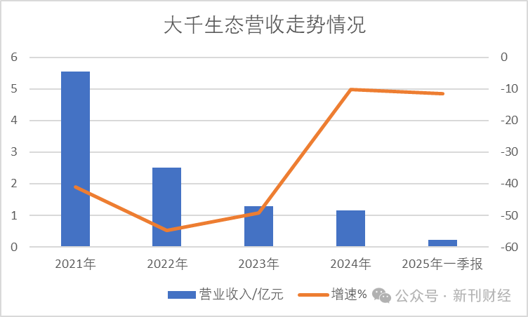 具体来看,大千生态营收规模呈现断崖式萎缩,从2021年超5亿元骤降至2023年的1亿元左右,三年累计跌幅近80%。更令人担忧的是,这种下滑趋势在2025年一季度仍未止住,营收同比继续下滑11.46%,仅实现0.22亿元收入,创下历史新低。