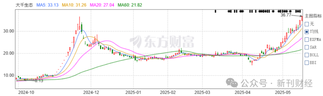 5月19日,大千生态(603955.SH)股价再度涨停,收盘报34.96元,较4月9日的14.77元累计涨幅超过130%,市值从不足15亿元快速膨胀至近50亿元。这一轮股价异动,是自2023年11月步步高系入主以来的第二次大幅波动。