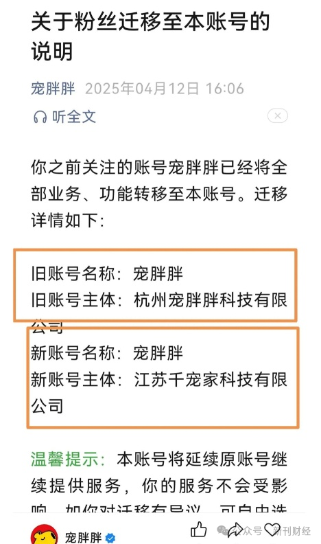 目前,宠胖胖已在全国布局19家子公司及100家终端门店,业务涵盖宠物医疗、用品等全产业链。4月12日,宠胖胖公众号粉丝完成向千宠家科技公司的迁移。由于宠胖胖的实际控制方为张源持股的苏州步步高投资发展有限公司,这一业务资源转移行为引发了市场广泛讨论。