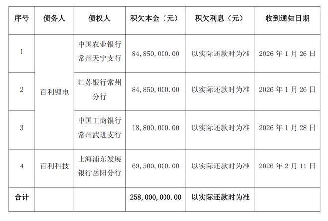 公告显示,百利科技及控股子公司常州百利锂电智慧工厂有限公司(简称“百利锂电”)于近日陆续收到中国农业银行常州天宁支行等银行发来的《贷款提前到期通知书》。因公司及百利锂电出现未按期足额支付利息等情形,上述银行依据相关合同约定,宣布合同项下贷款提前到期,并要求立即偿还积欠本息。