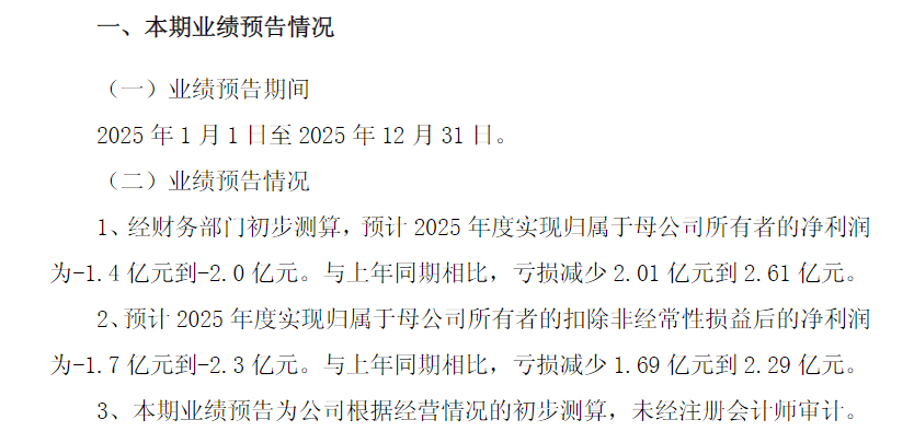 百利科技发布的2025年业绩预告显示,预计2025年度实现归属于母公司所有者的净利润为-1.4亿元到-2.0亿元。与上年同期相比,亏损减少2.01亿元到2.61亿元。预计2025年度实现归属于母公司所有者的扣除非经常性损益后的净利润为-1.7亿元到-2.3亿元。与上年同期相比,亏损减少1.69亿元到2.29亿元。