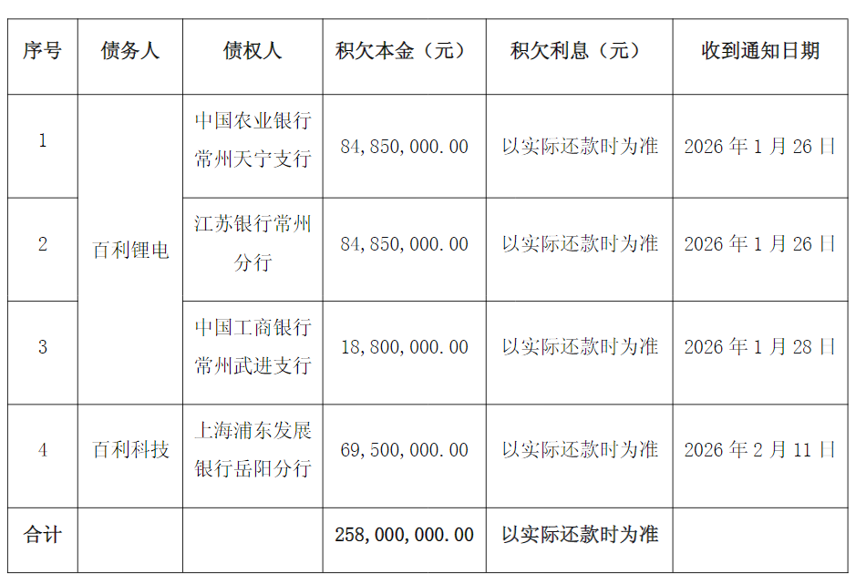 2月12日,百利科技发布公告披露,公司及控股子公司百利锂电收到农业银行常州天宁支行等银行发来的《贷款提前到期通知书》,因未按期足额支付利息,2.58亿元贷款被宣布提前到期,要求立即偿还积欠本息。