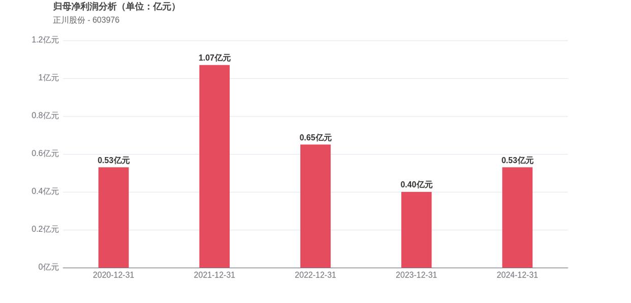 利润角度分析,2020年正川股份实现归母净利润0.53亿元,2024年0.53亿元。归母净利润在此期间保持相对稳定,但经历了较大波动。