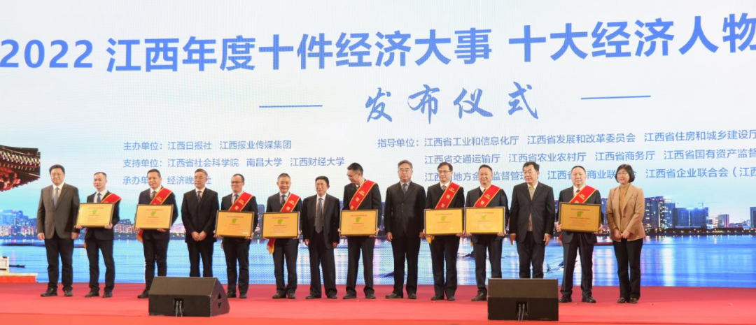 2022江西年度经济大事、经济人物、领军企业推荐发布活动由江西日报社、江西报业传媒集团主办,省工业和信息化厅牵头指导。先后组织推荐汇总全省年度经济大事素材30多件、优秀企业70多家、重量级经济人物50多名。经过评委会初评、网络点赞、信用信息查询、安全生产及环保情况核实等环节的比拼,终评审核后评选出2022江西年度十件经济大事、2022江西年度十大经济人物和25家2022江西年度领军企业。