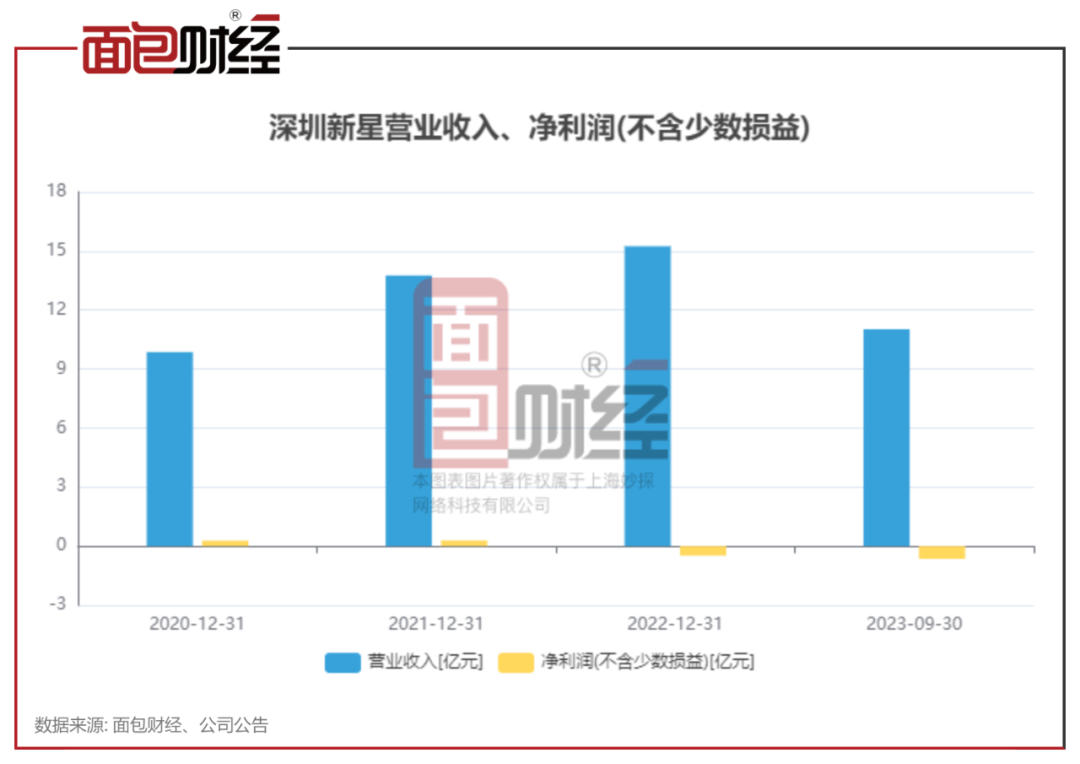 近年来,公司业绩增长持续承压。数据显示,2022年,深圳新星归母净利润亏损0.48亿元,同比下降267.06%;2023年前三季度,公司归母净利润亏损约0.65亿元,同比下降401.66%。