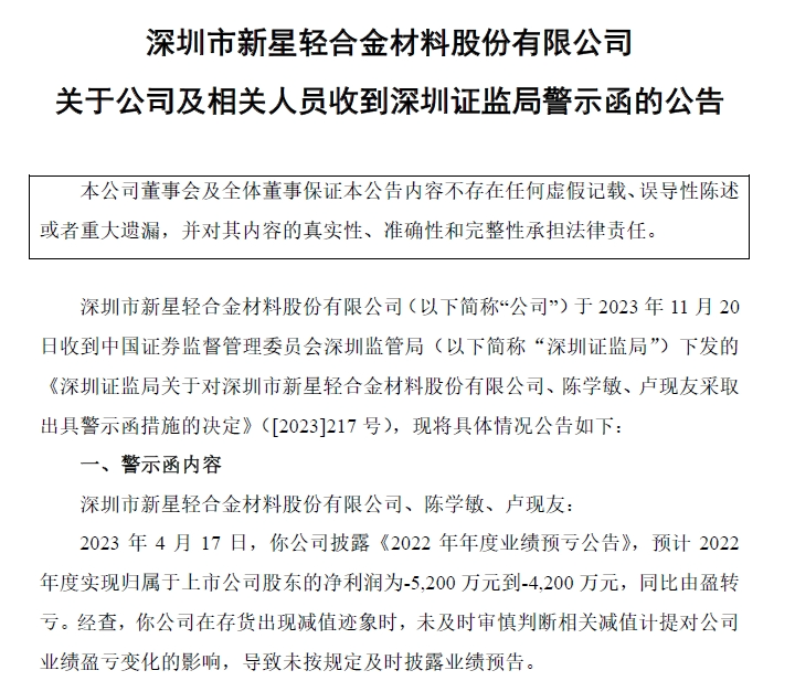 11月22日,深圳新星发布公告称公司及相关人员收到深圳证监局警示函。《警示函》显示,公司在存货出现减值迹象时,未及时审慎判断相关减值计提对公司业绩盈亏变化的影响,导致未按规定及时披露业绩预告。