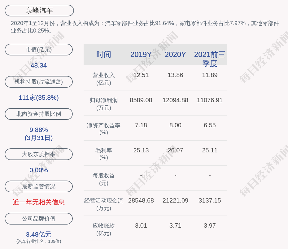 2020年1至12月份,泉峰汽车的营业收入构成为:汽车零部件业务占比91.64%,家电零部件业务占比7.97%,其他零部件业务占比0.25%。