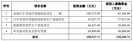 泉峰汽车3月31日披露的非公开发行A股股票预案(二次修订稿)显示,公司本次发行募集资金总额(含发行费用)不超过人民币228,360.74万元(含本数),扣除发行费用后的募集资金净额将用于高端汽车零部件智能制造项目(二期)、汽车零部件智能制造欧洲生产基地项目、新能源零部件生产基地项目、补充流动资金及偿还贷款。