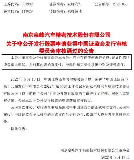 今日,泉峰汽车(603982.SH)发布公告,公司非公开发行股票的申请获得中国证监会发审委审核通过。
