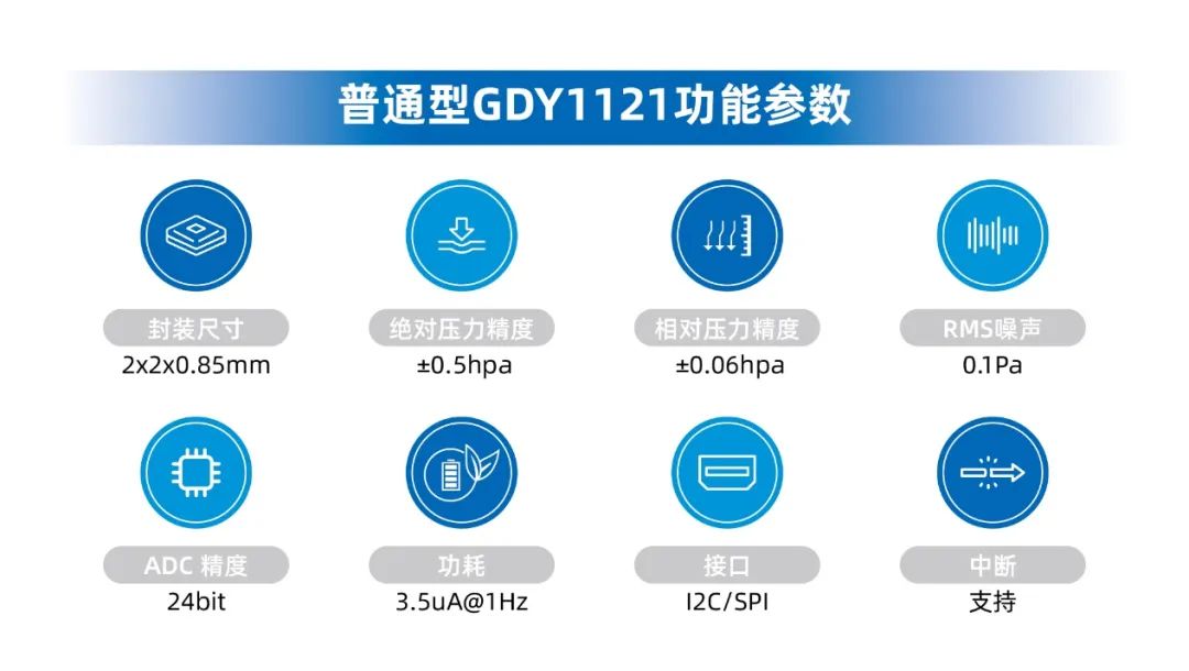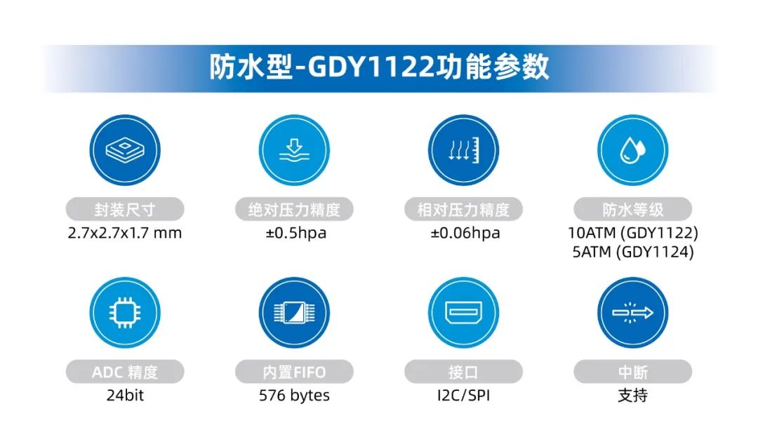 作为GDY1121的加强型,GDY1122支持10ATM防水等级,远领先于同类产品。其封装尺寸为2.7x2.7x1.7mm,绝对压力精度±0.5hPa,相对精度±0.06hPa,ADC精度达24bit。防水等级高达10ATM,能适应严苛环境。