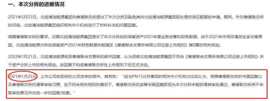 由于2021年市场环境发生变化等原因,北控清洁能源分拆后保留资产2021年财务数据未能满足《香港联合交易所有限公司证券上市规则》第8章的相关规定。