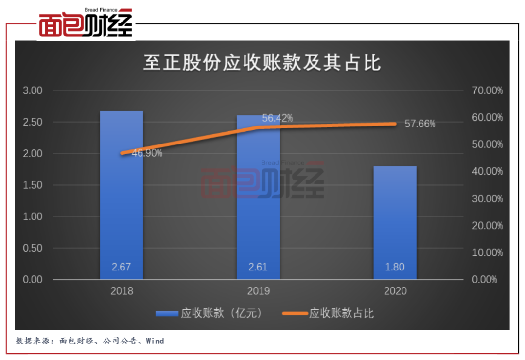 除了持续亏损,公司应收账款占比持续上升也值得注意。截至2020年末,公司应收账款账面价值为1.80亿元,同比下降31.11%,但在总营收中的占比从56.42%上升至57.66%。