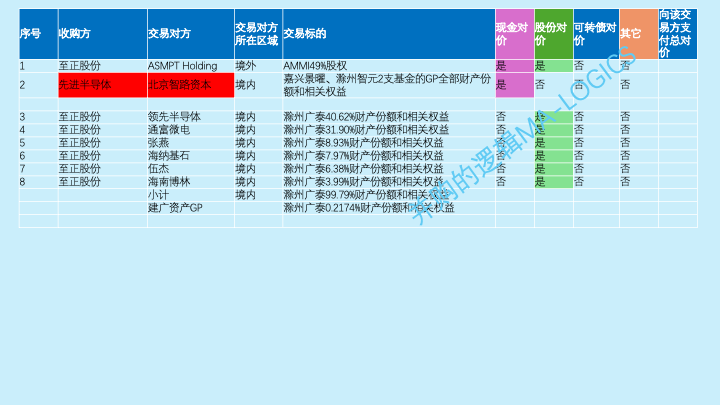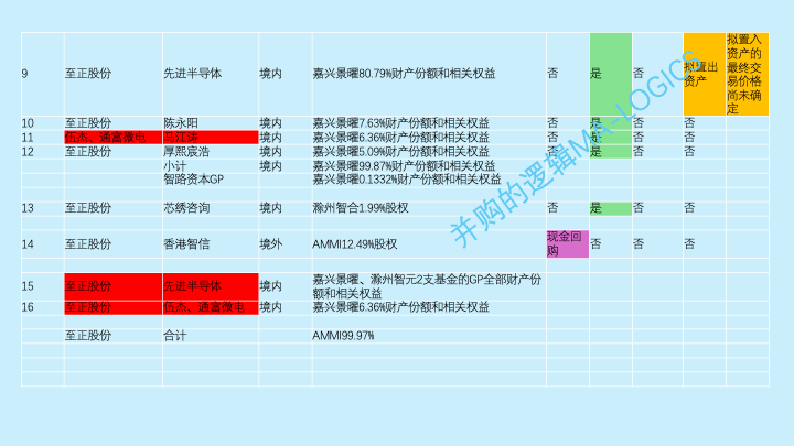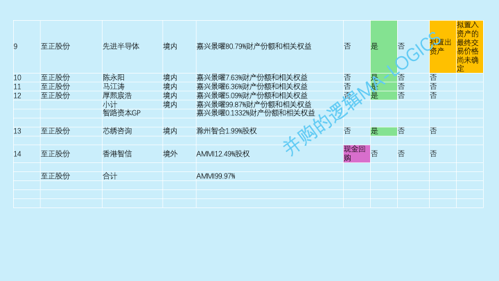大家都直接与至正股份直接交易。当时我们分析说,王强是至正股份的实控人,也是智路资本GP基金滁州智元和嘉兴景曜的主要间接LP,如果王强作为LP话语强,那么就是同一实控下的交易,不构成借壳。如果王强作为LP的话语权不强,那么AMMI的实控人就是智路资本,本交易就构成了借壳上市,要走IPO一样的流程和要求。