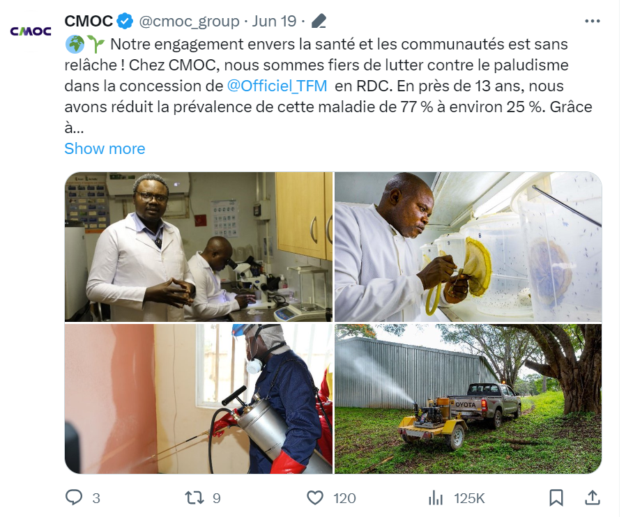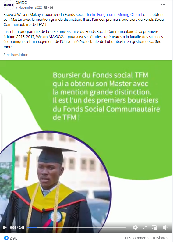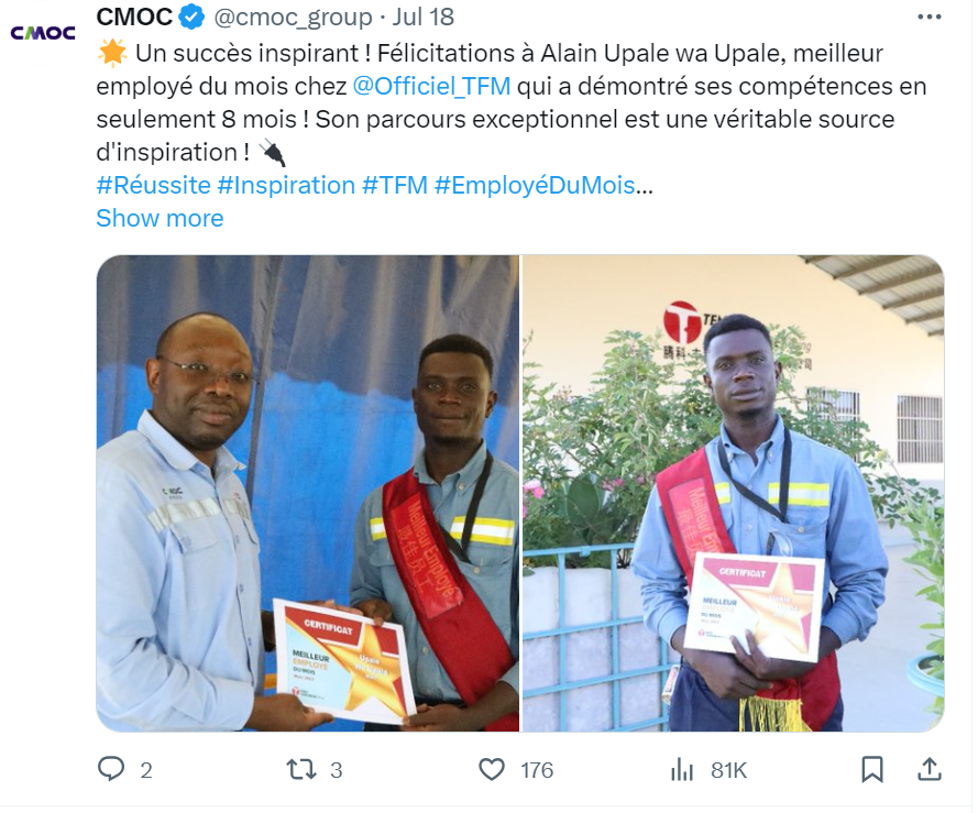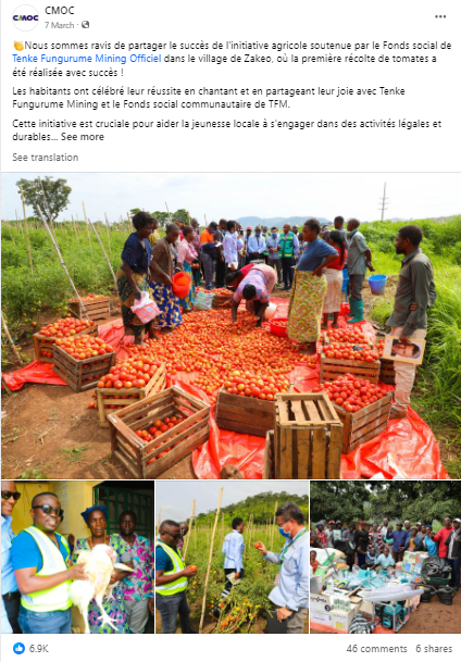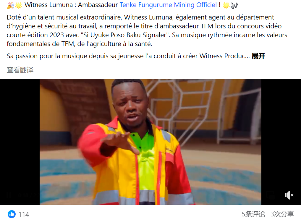 近阶段,刚果(金)TFM员工自编自唱Hip-hop歌曲、TFM奖学金获得者硕士毕业、受到公司农业扶持的村庄迎来西红柿大丰收、TFM最佳员工颁奖、为刚果(金)周边社区治疗疟疾等内容,获得了粉丝热烈的互动。