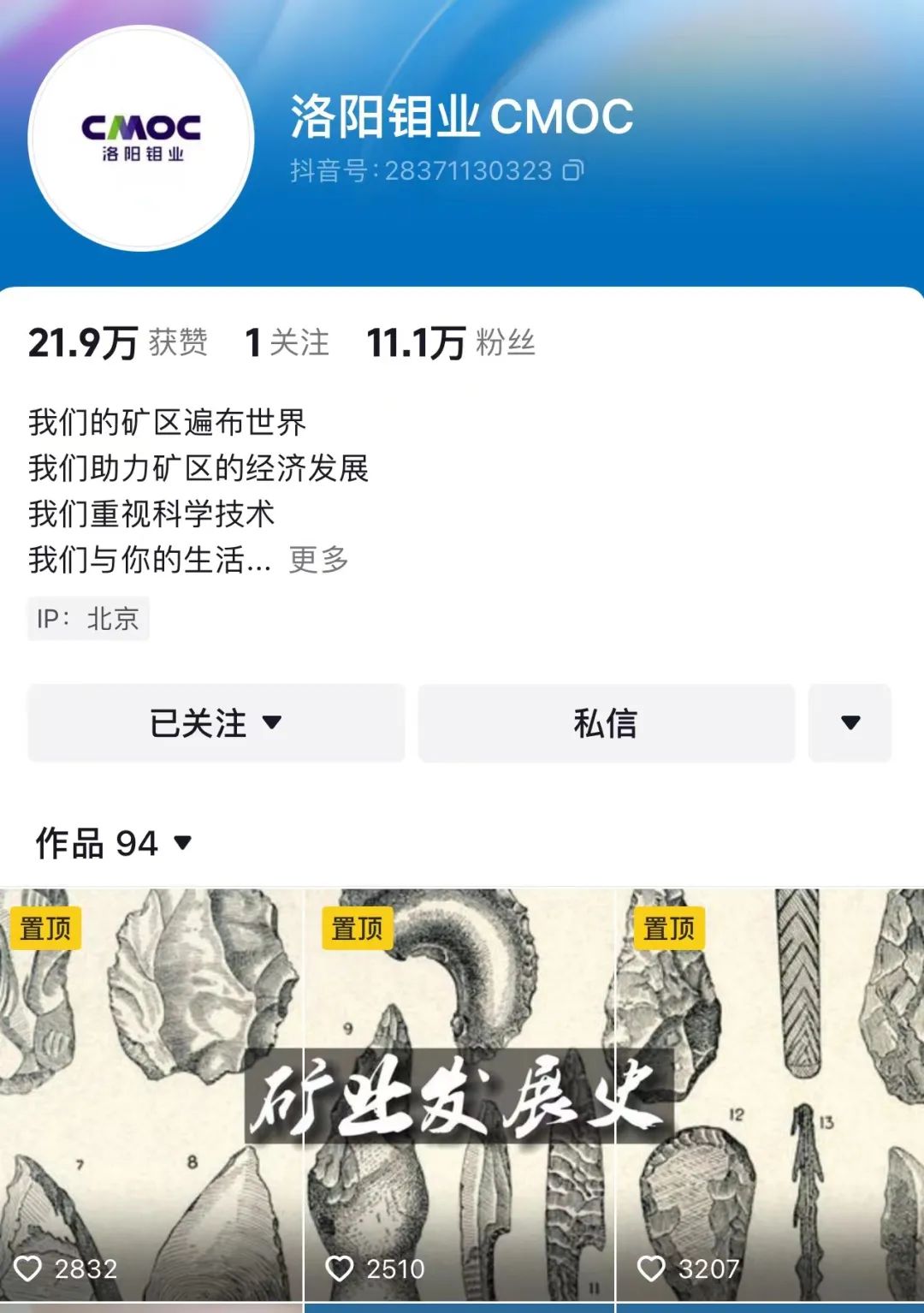 洛阳钼业(CMOC)海内外传播体系建设再获新突破!近日,公司脸书账号(@cmoc group)粉丝数突破10万+,海外官方X账号(原推特,@cmoc_group)粉丝数突破1.1万;同时,官方抖音账号(洛阳钼业CMOC)粉丝数突破11.1万。