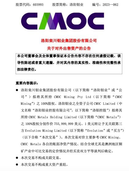12月5日,洛阳栾川钼业集团股份有限公司(以下简称“洛阳钼业”或“公司”)发布关于对外出售资产的公告。公告称,公司“)拟将其所持CMOC Mining Pty Ltd(以下简称”CMOC Mining“)之100%股权、洛阳钼业之全资子公司CMOC Limited(中文名称”洛阳钼业控股有限公司“,以下简称”洛钼控股“)拟将其所持CMOC Metals Holding Limited(以下简称”CMOC Metals“)之100%股权分别作价755,999,999美元、1美元转让予无关联第三方Evolution Mining Limited(以下简称”Evolution“或”买方“)(以下合称”本次交易)。