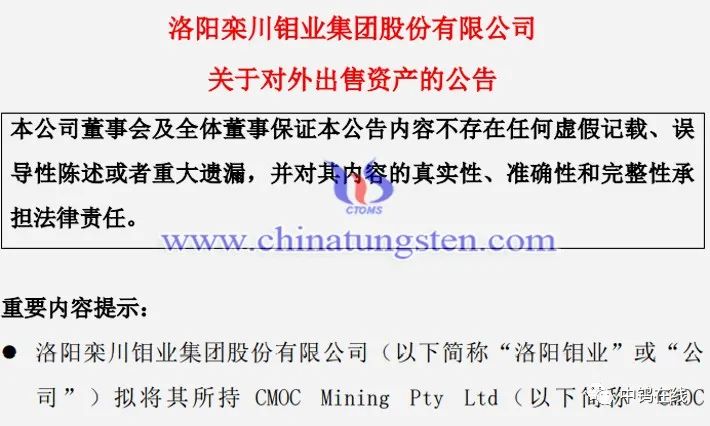 近日,洛阳钼业发布公告称,公司将其所持CMOC Mining、CMOC Metals两家子公司的全部股权,以共计7.56亿美元的对价转让给Evolution,交割日预计在2023年12月底前,交割地点为位于澳大利亚新南威尔士州悉尼法雷尔广场1号总督菲利普大厦61层金杜律师事务所悉尼办事处。
