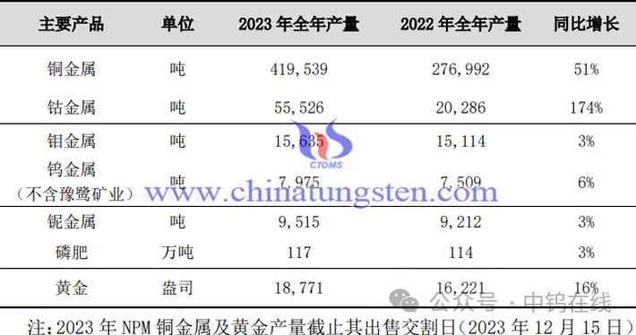2023年,洛阳钼业金属钨产量(不含豫鹭矿业)7,975吨,较2022年7,509吨上涨6%;金属钼产量15,635吨,较2022年15,114吨上涨3%;金属铜产量419,539吨,较2022年276,992吨上涨51%;金属钴产量55,526吨,较2022年20,286吨上涨174%;金属铌产量9,515吨,较2022年9,212吨上涨3%;磷肥产量117万吨,较2022年114万吨上涨3%;黄金产量18,771盎司,较2022年16,221盎司上涨16%。