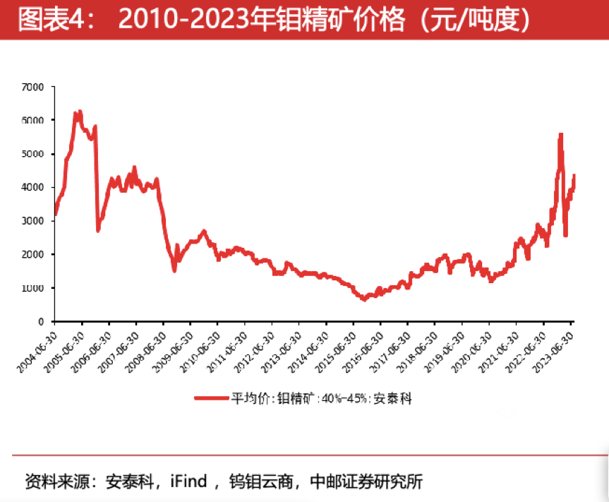 环保因素之外,近年来钼金属行情并不稳定。中邮证券在研报中指出,2009年至2016年,全球经济处于下行周期,钼价虽有反弹但整体仍维持向下趋势。2017年至2021年,国内钢铁行业景气度反转向好,钼铁价格逐渐走强,多次迎来跳涨,但总体上涨幅度不明显,仍保持在较低水平。2022年以来,因海外铜矿品位下滑等因素影响,钼价持续上涨,一度创下近17年新高至5570元/吨度。