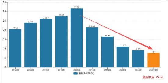 然而,我们发现,公司上市前后毛利率差异反差极大。上市前夕,公司的毛利率超过20%,且呈现出上涨趋势;而上市后,公司毛利率整体呈现出下降趋势,毛利率由2020年的31.82%大幅下降至2025年三季度的7.86%。公司毛利率跌幅如此之大,这背后又有何玄机?