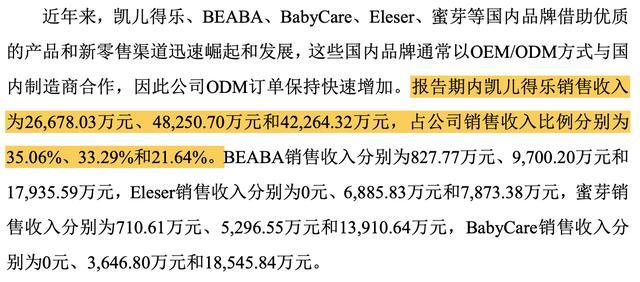 而在这些大客户之中,凯儿得乐尤为突出。2016年,凯儿得乐对豪悦护理贡献的销售收入仅为700.27万元;2017飙升至2.67亿元,随后两年分别为4.83亿元和4.23亿元,占公司销售收入比例分别为35.06%、33.29%和21.64%。