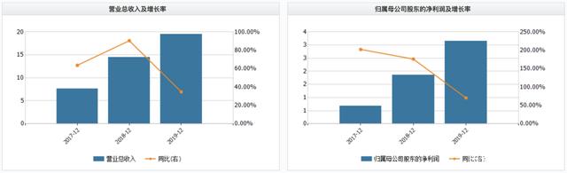 Wind数据显示,豪悦护理2017年-2019年实现营收分别为7.61亿元、14.50亿元和19.53亿元,同比增速分别为63.69%、90.48%和34.76%;同期归母净利润分别为0.67亿元、1.85亿元和3.15亿元,同比增速分别为202.41%、176.19%和70.35%。