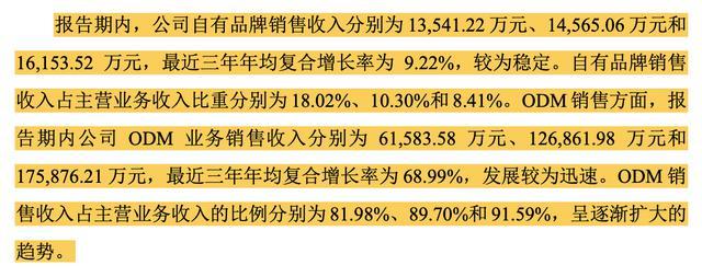 招股书显示,豪悦护理2017年-2019年ODM模式业务销售收入分别为6.16亿元、12.69亿元和17.59亿元,占主营业务收入的比例分别为 81.98%、89.70%和 91.59%,此三年年均复合增长率为 68.99%;同期公司自有品牌销售收入分别为1.35亿元、1.46亿元和1.62亿元,占主营业务收入比重分别为 18.02%、10.30%和 8.41%,此三年年均复合增长率为 9.22%。业内人士指出,由此可见,豪悦护理营收大多依赖贴牌加工业务,自有品牌业绩贡献占比小,且比重仍在下降。