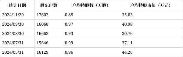 从12月2日公开信息显示,豪悦护理截至2024年11月29日公司股东户数为1.76万户,较上期(2024年9月30日)增加1534户,增幅为9.55%,持股趋于分散。