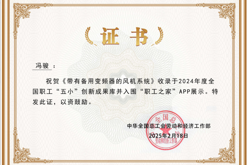 近日,杭州热电旗下临江环保的创新成果《带有备用变频器的风机系统》成功收录于2024年度全国职工“五小”创新成果库。该项目从全国总工会征集的3.4万项成果中脱颖而出,成为5000项“五小”展示成果之一,并通过为期3天的投票成功跻身年度人气TOP500行列。