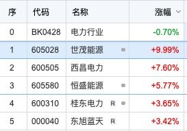 5月30日上午,电力股继续活跃,截至上午收盘,世茂能源涨停,恒盛能源、新中港、桂东电力、东旭蓝天、建投能源等跟涨。
