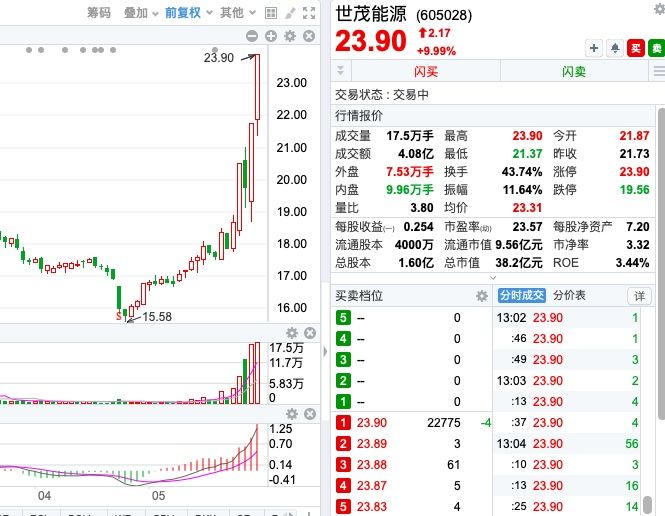 世茂能源近4个交易日内录得3个涨停,累计涨幅为28.22%。截至上午收盘,该股今日成交金额4.06亿元,换手率43.61%,最新A股总市值达38.24亿元。