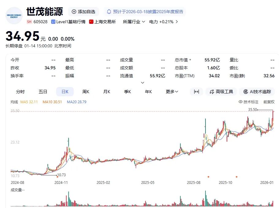 停牌前,世茂能源股价于1月9日报34.95元/股,最新市值为55.92亿元;1月7日至9日,该股涨幅为20.52%。