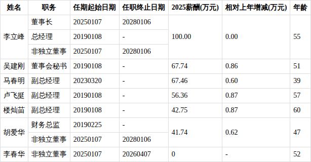 根据2025年报数据,剔除独立董事、监事会主席、监事后,世茂能源共有7位董事和高级管理人员。从年龄看,世茂能源董事和高级管理人员平均年龄为52岁,年龄中位数为52岁,其中,副总经理楼灿苗年龄最高为60岁,副总经理马春明年龄最小为39岁。从薪酬看,董事和高级管理人员合计领取报酬376.05万元,平均薪酬62.67万元,年薪中位数为61.91万元。其中,董事长、总经理及非独立董事李立峰薪酬最高为100.00万元,财务总监及非独立董事胡爱华薪酬最低为41.74万元(2025年任期不满1年的不参与统计)。