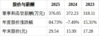 近三年董事和高级管理人员薪酬方面,2023年薪酬总额为318.11万元,2024年薪酬总额为372.23万元,2025年薪酬总额为376.05万元。从2023年到2025年,董事和高管薪酬总额增加57.94万元,增幅18.21%。