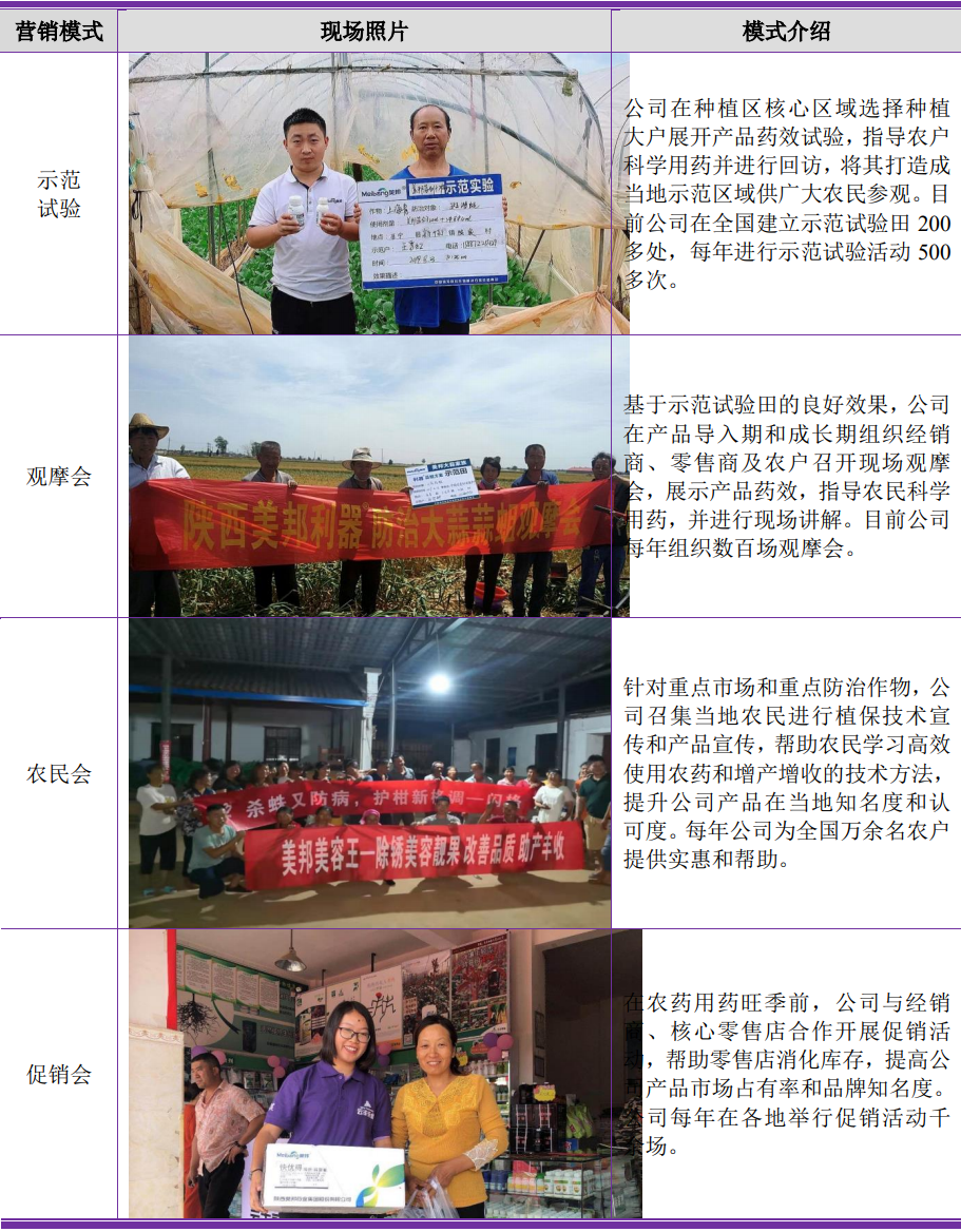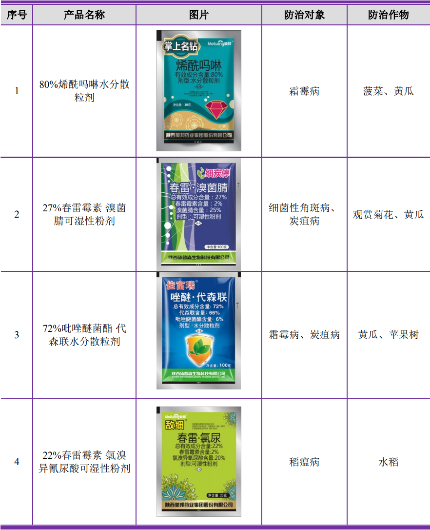 在产品方面,公司自设立以来持续深耕于农药制剂行业,通过先进的技术、丰富的产品、稳定的质量积累了良好的品牌和口碑,其中80%甲基硫菌灵可湿性粉剂曾获第四届绿色农药博览会金奖;“美邦植贝健(2%24-表芸·嘌呤水分散粒剂)”荣获2022“品质苹果”优秀植物生长调节剂;“佳途75%肟菌·戊唑醇水分散粒剂”、“巨力健10%赤霉·胺鲜酯可溶粒剂”等多项产品荣获绿色高质量农药产品;“敌细(22%春雷·氯尿可湿性粉剂)”被评为2022年度优秀植物健康产品;“佳色(30%氯化胆碱·三十烷醇悬浮剂)”、“聚星(3%硝钠·胺鲜酯水剂)”等多项产品荣获2022年全国植保市场植物生长调节剂畅销品牌产品;“10%苄氨基嘌呤·胺鲜酯水分散粒剂的开发与应用”荣获第十五届中国农药工业协会农药创新贡献奖;多项产品获得陕西省名牌产品证书。“美邦农药”、“美邦金点子”、“美邦”及LOGO荣获陕西好商标,“甲托”于2015年曾获中国驰名商标。公司以严格的管理、优良的产品和一流的售后服务在农药行业享有盛誉,市场竞争地位日益凸显。