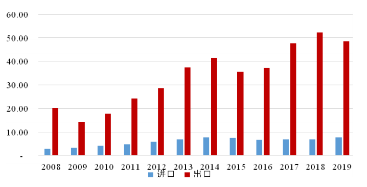 2008-2019年我国农药进出口金额(单位:亿美元)