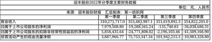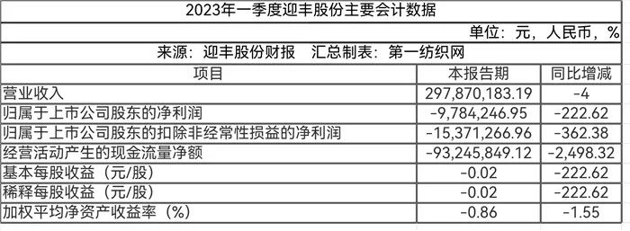 2023年一季度,迎丰股份实现营业收入2.97亿元,与上年同期相比下降4.00%,实现归属于上市公司股东的净利润亏损978.42万元,与上年同期相比下降222.62%。