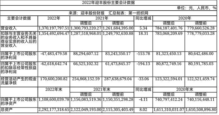第一纺织网4月26日消息(记者 martin 报道):浙江迎丰科技股份有限公司(以下简称“迎丰股份”)今天(4月26日)晚间发布2022年年报,报告期内,公司实现营业收入13.70亿元,与上年同期相比增加5.34%,实现归属于上市公司股东的净利润亏损4748.35万元,与上年同期相比减少153.78%,扣除非经营性损益后归属于上市公司股东的净利润亏损6261.86万元,与上年同期相比194.13%,基本每股收益下降155.00%。