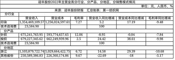 对于业绩变动的主要原因,迎丰股份解释称,营业收入增长主要公司产能发挥带动公司产销量增加所致;净利润亏损主要是报告期内全国纺织品服装内需疲软,市场订单大幅减少,公司产能无法有效发挥,生产成本无法向下游转嫁,加之天然气、电力、蒸汽等能源价格上涨,生产成本大幅增加,进一步压缩了印染业务的利润空间,导致毛利率同比下降。