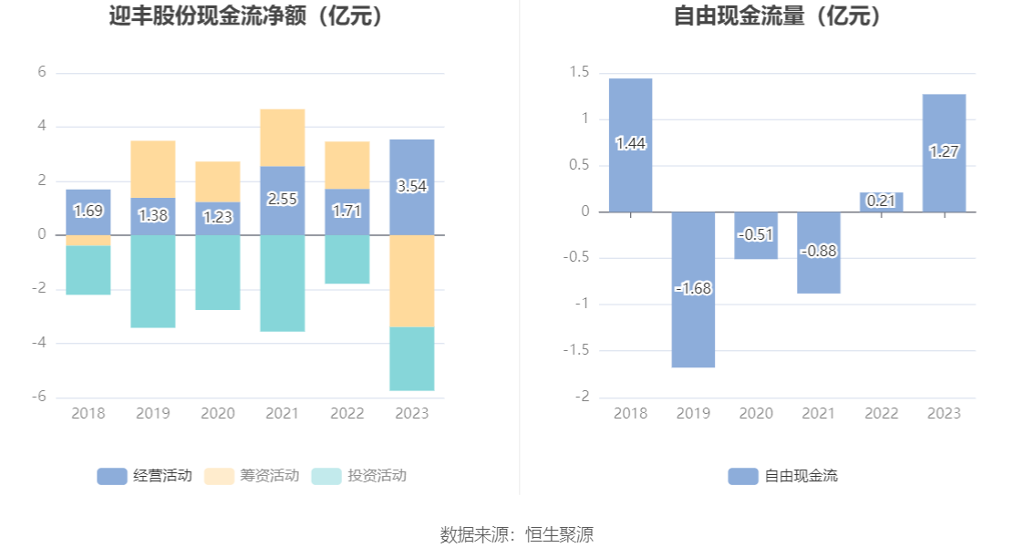 截至2023年,公司经营活动现金流净额为3.54亿元,同比增长107.55%;筹资活动现金流净额-3.4亿元,同比减少5.15亿元;投资活动现金流净额-2.36亿元,上年同期为-1.8亿元。进一步统计发现,2023年公司自由现金流为1.27亿元,相比上年同期增长509.87%。